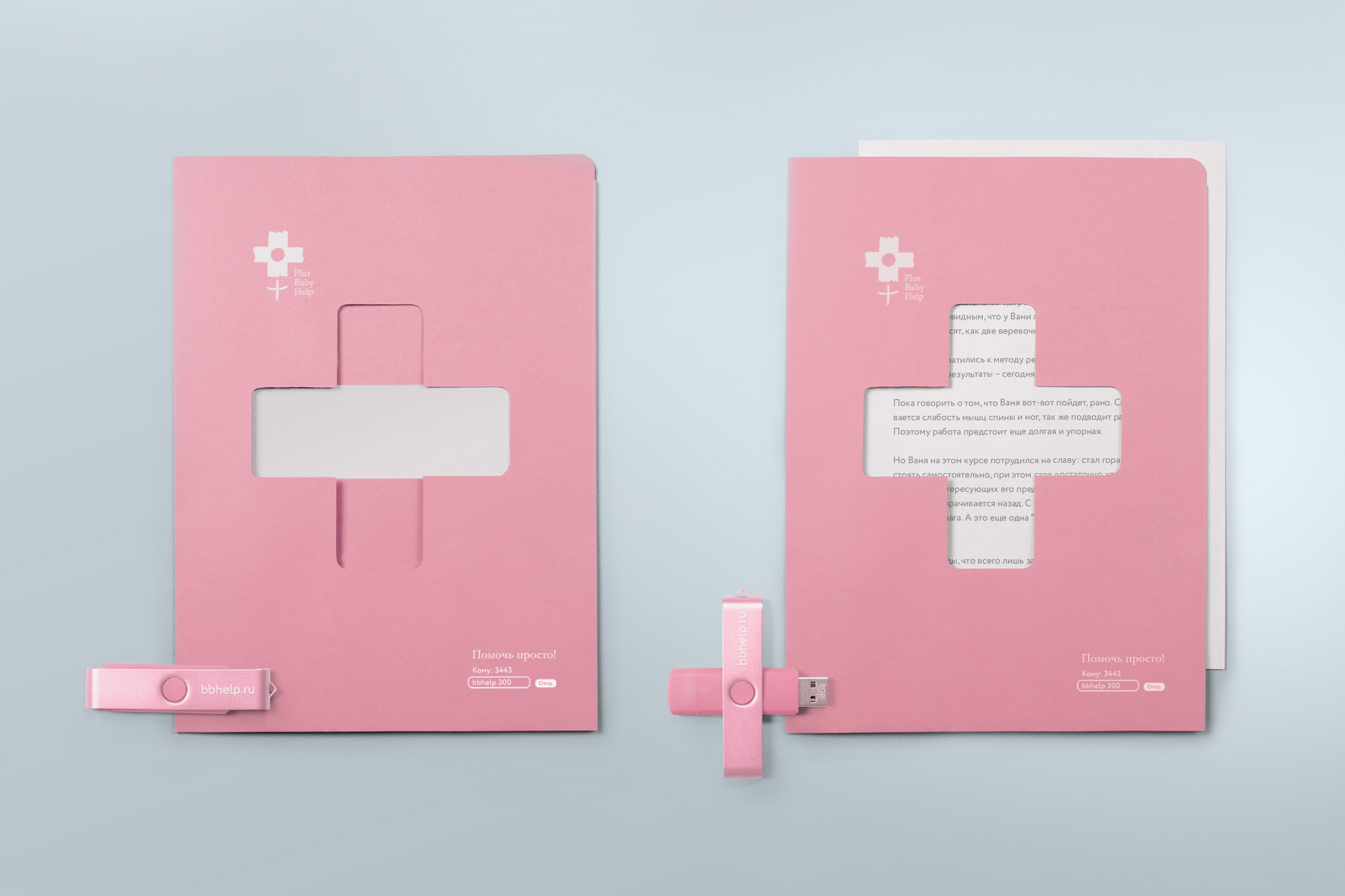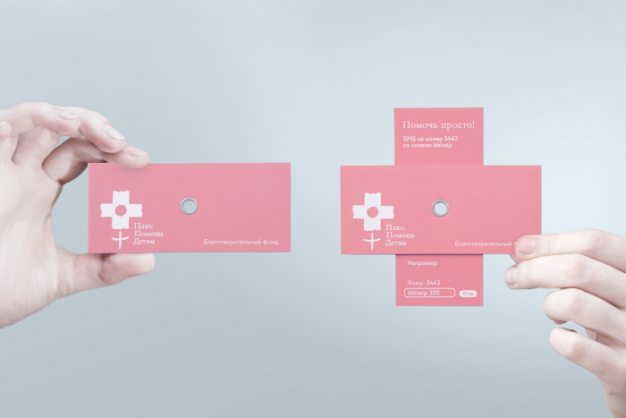 История развивается на различных носителях фирменного стиля, взаимодействуя с которыми каждый может одним движением руки превратить минус в плюс. Добавить свой плюс в большое дело так же просто, как открыть блокнот или развернуть визитку — к примеру, отправив смс с указанием суммы дарения на короткий номер.