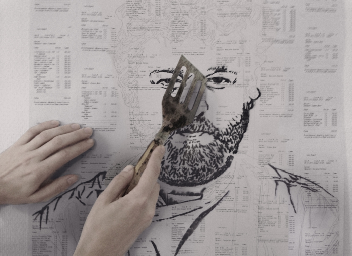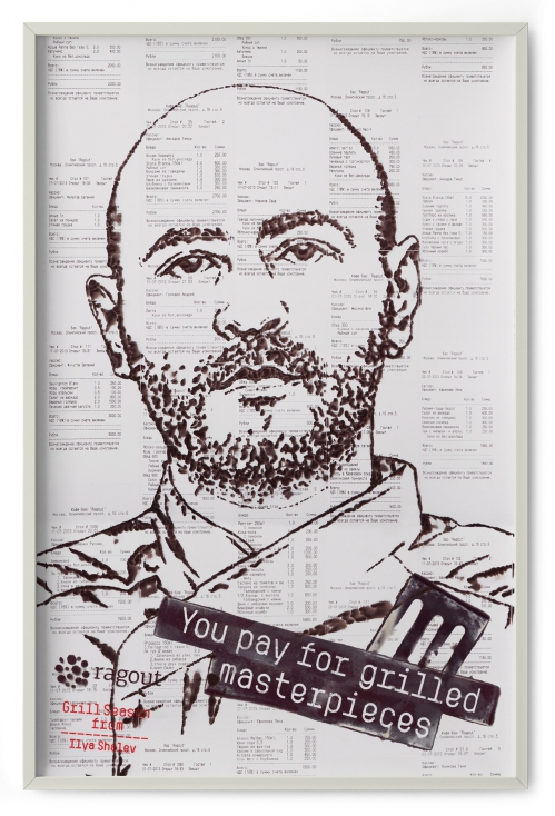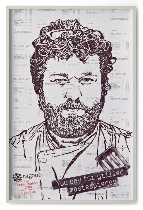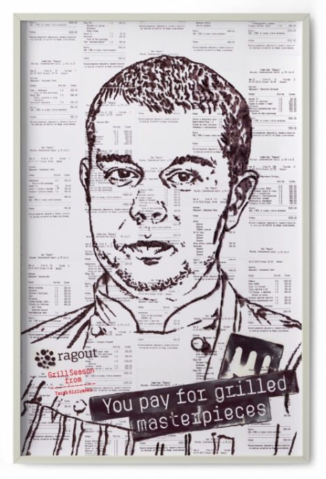 Счета, собранные в кафе, стали отличными «полотнами»: ведь термочеки меняют цвет от взаимодействия с горячими предметами. В результате на чековых «холстах» раскаленными лопатками для гриля было создано три портрета шеф-поваров Ragout.