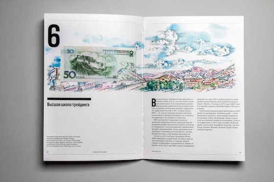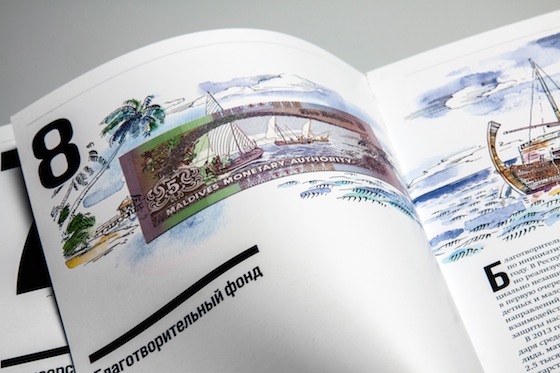 Рисунки на шмуцтитулах (страницах, предваряющих раздел книги) графически развивают сюжеты, изображённые на банкнотах разных валют мира. Выходя за границы периметра купюры, они придают привычным денежным знакам новый смысл и новое содержание. Сама купюра, встроенная в рисунок, становится органичной частью чего-то более широкого и полного, открытого и вдохновляющего.