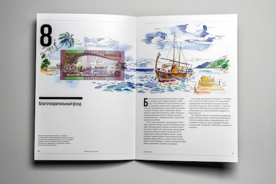 Буклет также расширяет эрудицию его читателей: на шмуцтитулах с текстом отчета соседствуют интересные факты об украшающих купюры памятниках архитектуры, природных местах, исторических личностях и национальных символах.
