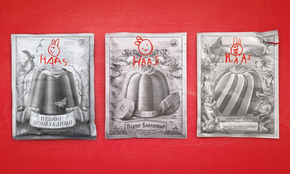 Агентство Depot WPF разработало необычный дизайн упаковки для пудингов HAAS, производимых австрийской компанией Ed. Haas International. Разрабатывая проект, креаторы обнаружили, что многие российские потребители считают пудинги не очень вкусным и неинтересным десертом. Их часто вовсе не замечают на полках магазинов среди разрыхлителей и других товаров для выпечки с похожим оформлением.