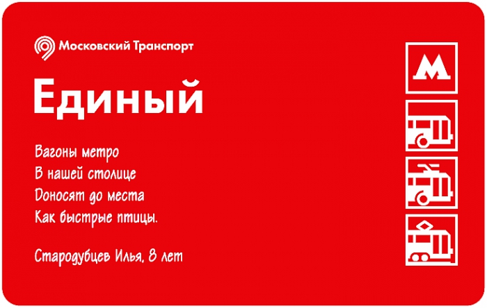 Тематические билеты уже появились в кассах столичного метро. На лицевой стороне билета напечатано четверостишие, а также имя и возраст автора. На оборотной стороне нарисован логотип конкурса «Город в движении».