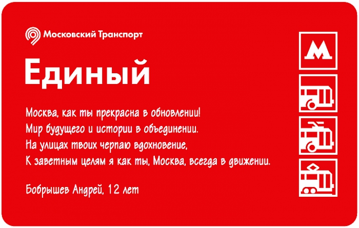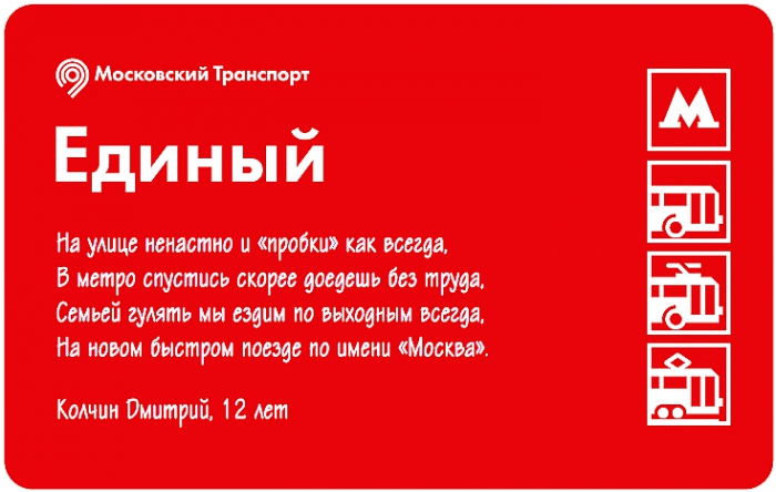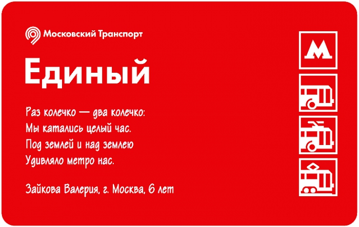 Победителями конкурса признали сразу пять человек: Валерия Зайкова (6 лет), Андрей Бобрышев (12 лет), Дмитрий Колчин (12 лет), Матвей Табах (12 лет) и Илья Стародубцев (8 лет) , именно их стихи и появились на билетах «Единый». Помимо признания жюри они также получат сертификаты на посещение детского парка игрового обучения «Кидзания».