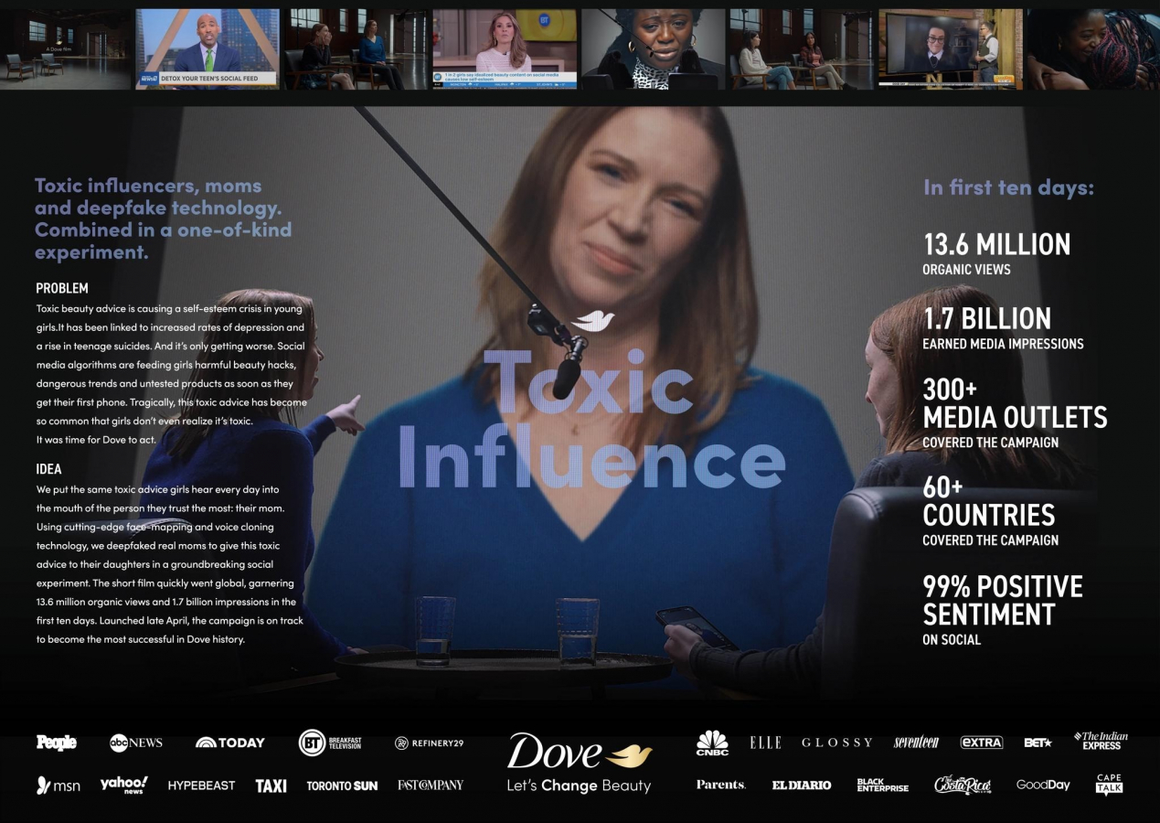 Dove «Toxic Influence» (проект создан в рамках глобальной платформы Dove при участии Ogilvy в сотрудничестве с VMLY&R и Edelman). Проект стал частью глобальной инициативы Dove Self-Esteem Project и был направлен на борьбу с токсичным влиянием социальных сетей на самооценку подростков, принятие себя и эмоциональный комфорт.