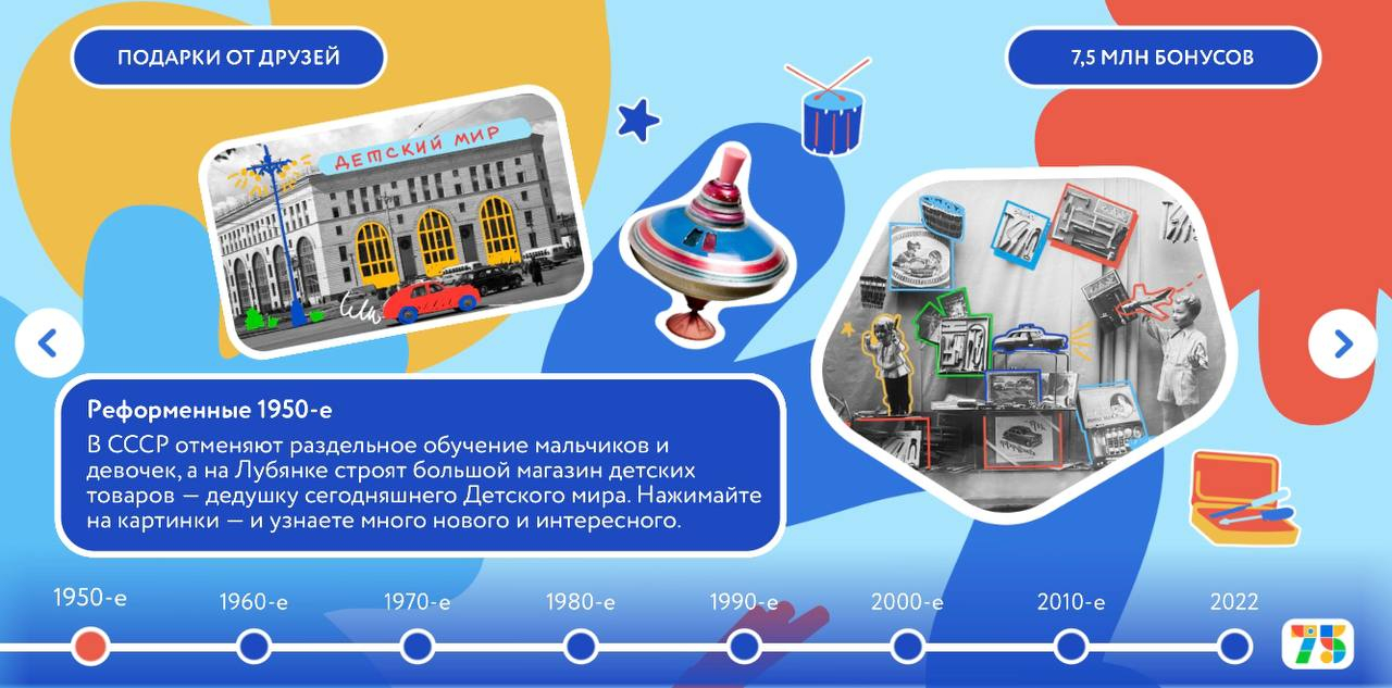 Также ко дню рождения «Детского мира» агентство «Пикчер» создало интерактивный исторический юбилейный лендинг, на страницах которого представлены основные факты из истории становления и развития сети, а также изображены игрушки времен СССР, которые одними из первых оказались на полках «Детского мира».