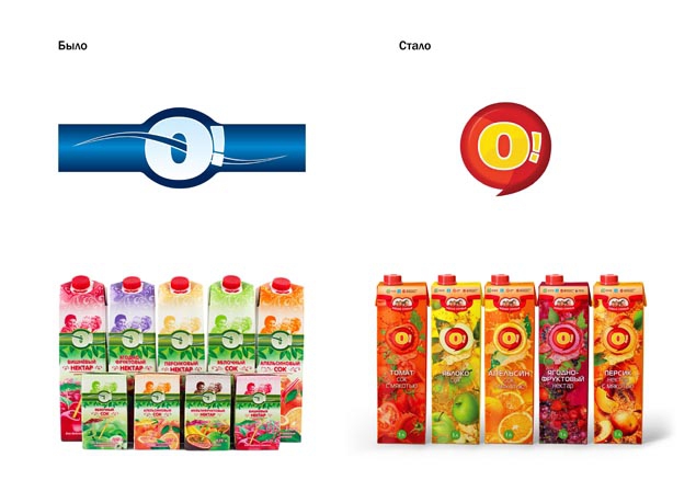 Студия DEZA поработала над логотипом и оформлением упаковки напитков и соков под брендом «О!» в связи с изменением позиционирования компании.