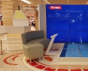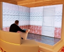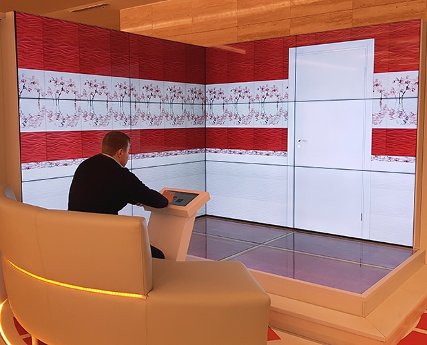 При помощи специального планшета можно выбирать различные отделочные материалы и проецировать их на предполагаемые стены и пол «комнаты», состоящей из нескольких десятков видео-экранов. Таким образом, «примерив» различные варианты сочетаний обоев, керамической плитки, дверей, ламината