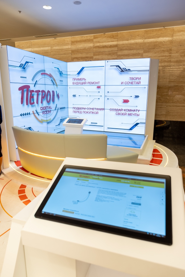 Проект выполнен на ИТ-платформе собственной разработки. Цифровой шоурум оборудован современными LCD-дисплеями. Они обеспечивают четкое изображение, а также высокую видимость и одинаковую яркость на бесшовной видеостене. В ассортименте цифровой комнаты — тысячи наименований отделочных материалов. Среди прочего оборудования — планшет для моделирования дизайна, тач-экран для заказа продукции и комфортный диван.