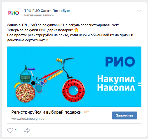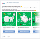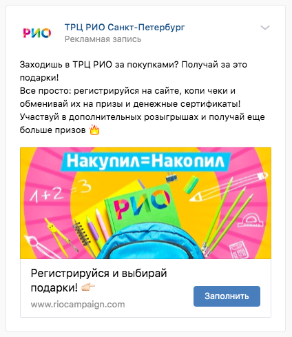 На этапе подбора рекламных каналов было очевидно, что контекстное размещение не применимо к данной задаче. Нужно искать нашу целевую аудиторию по совокупности поведенческих признаков. Нюанс данной кампании еще и в том, что мы ограничены гео положением ТРЦ, и показ предложения, каким бы они ни было выгодным, пользователям в других районах СПб — бессмысленно. Запустили кампании в соц.сетях Вконтакте, Instagram и на платформе MyTarget.