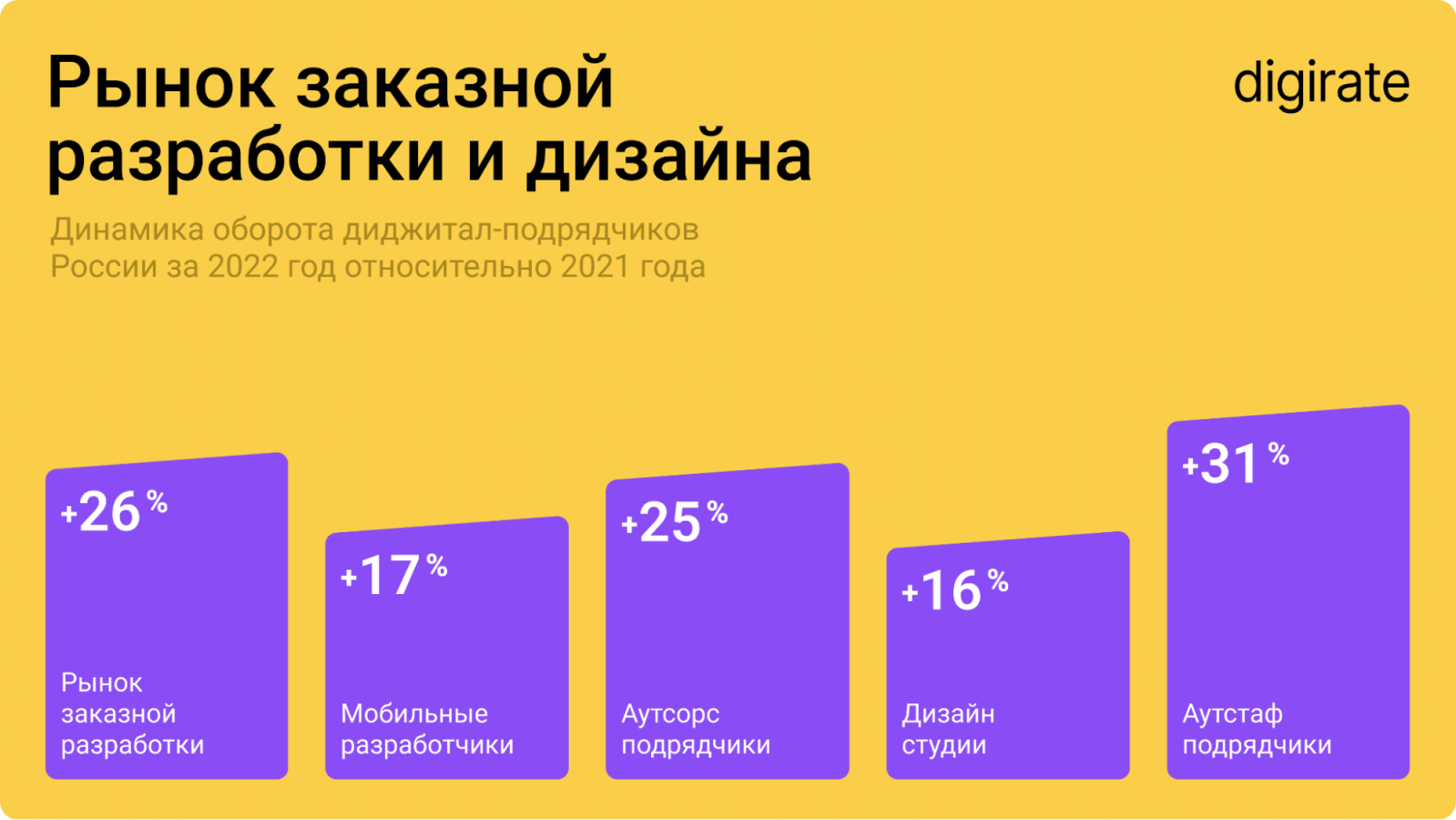 Помимо оборотов диджитал-подрядчиков, рейтинг отражает динамику рынка России: например, за 2022 год рынок заказной разработки вырос на 26%, мобильные разработчики — на 17%, аутсорс-подрядчики — на 25%, а дизайн-студии — на 16%. Наибольший рост продемонстрировали аутстаф-подрядчики: их оборот вырос на 31% по отношению к 2021 году.