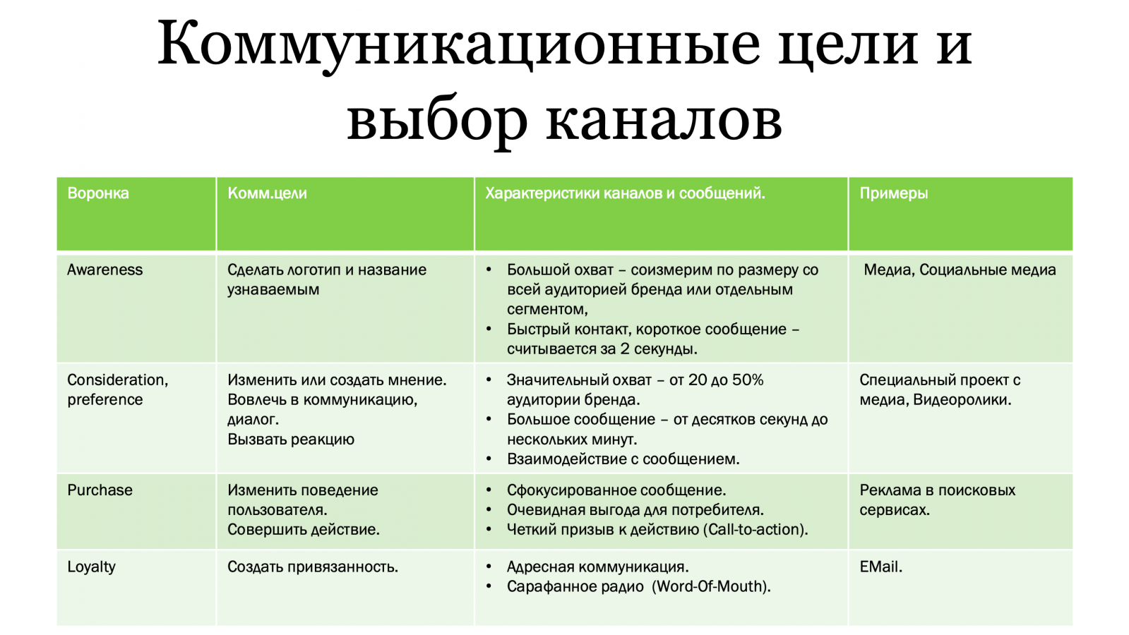 Вот пример, как могут соотноситься цели и каналы на каждом этапе воронки продаж.