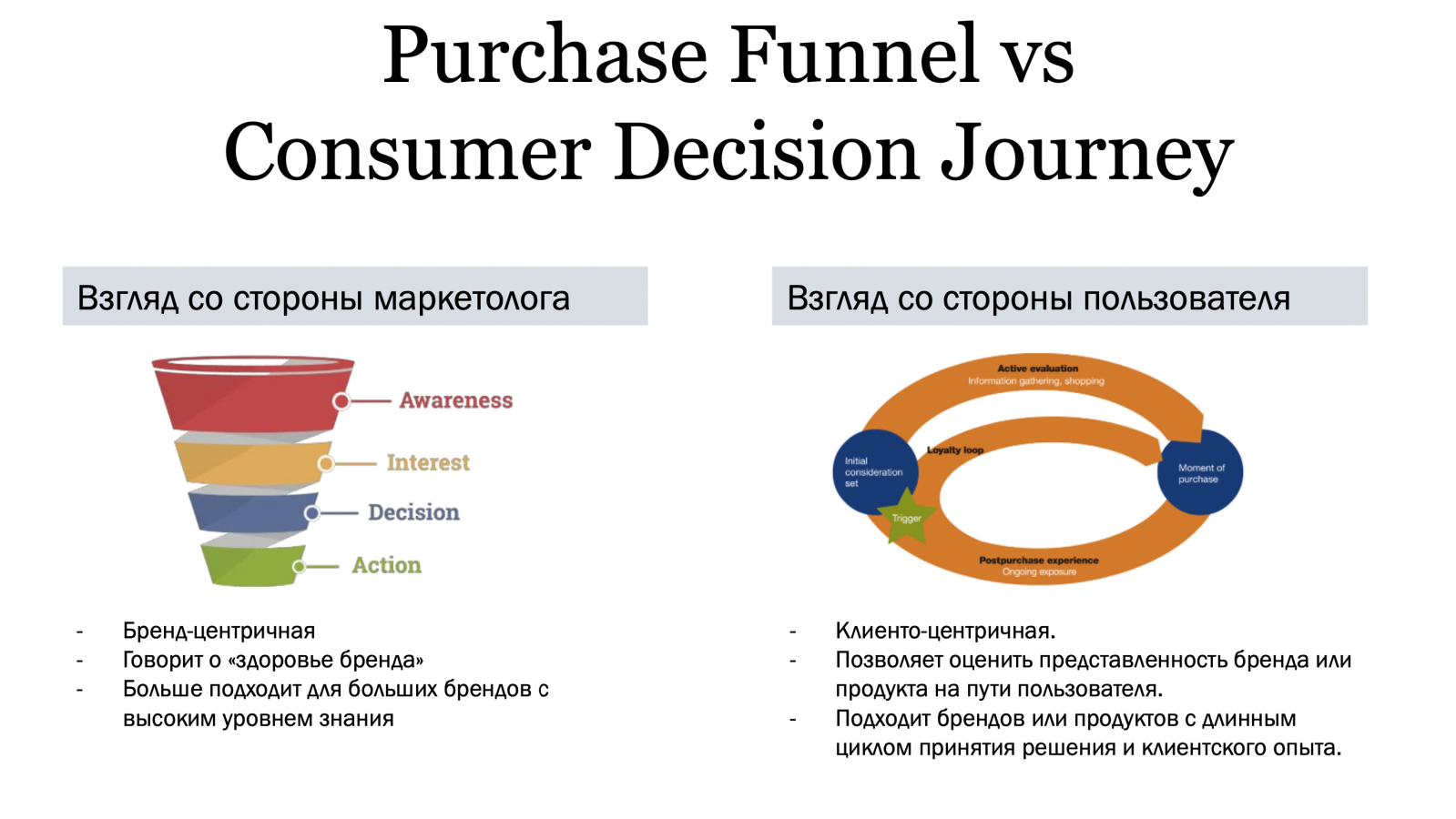 Путь пользователя (сonsumer decision journey) клиентоцентричный. Работая с этой моделью, маркетолог должен думать, на каком из этапов пути бренд должен появиться и в каком виде, и уже исходя из этого планировать коммуникацию, стратегию и инвестиции.