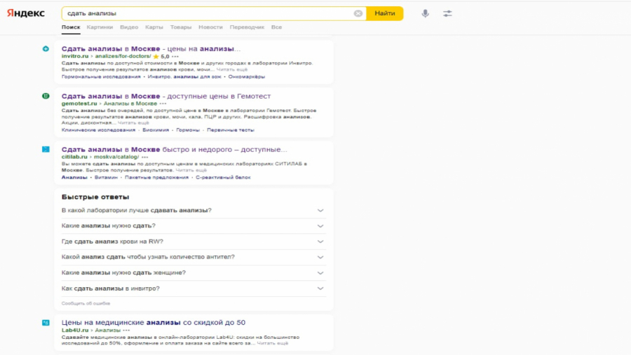 Конкуренция в этой сфере высокая, но интернет-площадки гигантов уже получили такой «авторитет» у поисковых систем, что способны с ней справиться. К примеру, у «Инвитро» может быть меньше филиалов в конкретном городе, чем у местной компании, однако «Яндекс», скорее всего, поставит сайт крупного игрока в топ и по высокочастотным, и по среднечастотным запросам.