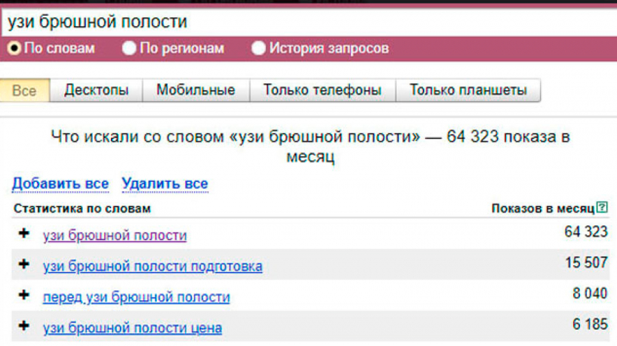 К примеру, в июне 2022 года пользователи Москвы и Подмосковья ввели в «Яндекс» около 64 тыс. запросов, содержащих фразу «УЗИ брюшной полости». Ещё более 30 тыс. запросов касались УЗИ малого таза, а 29, 9 тыс. — УЗИ почек.