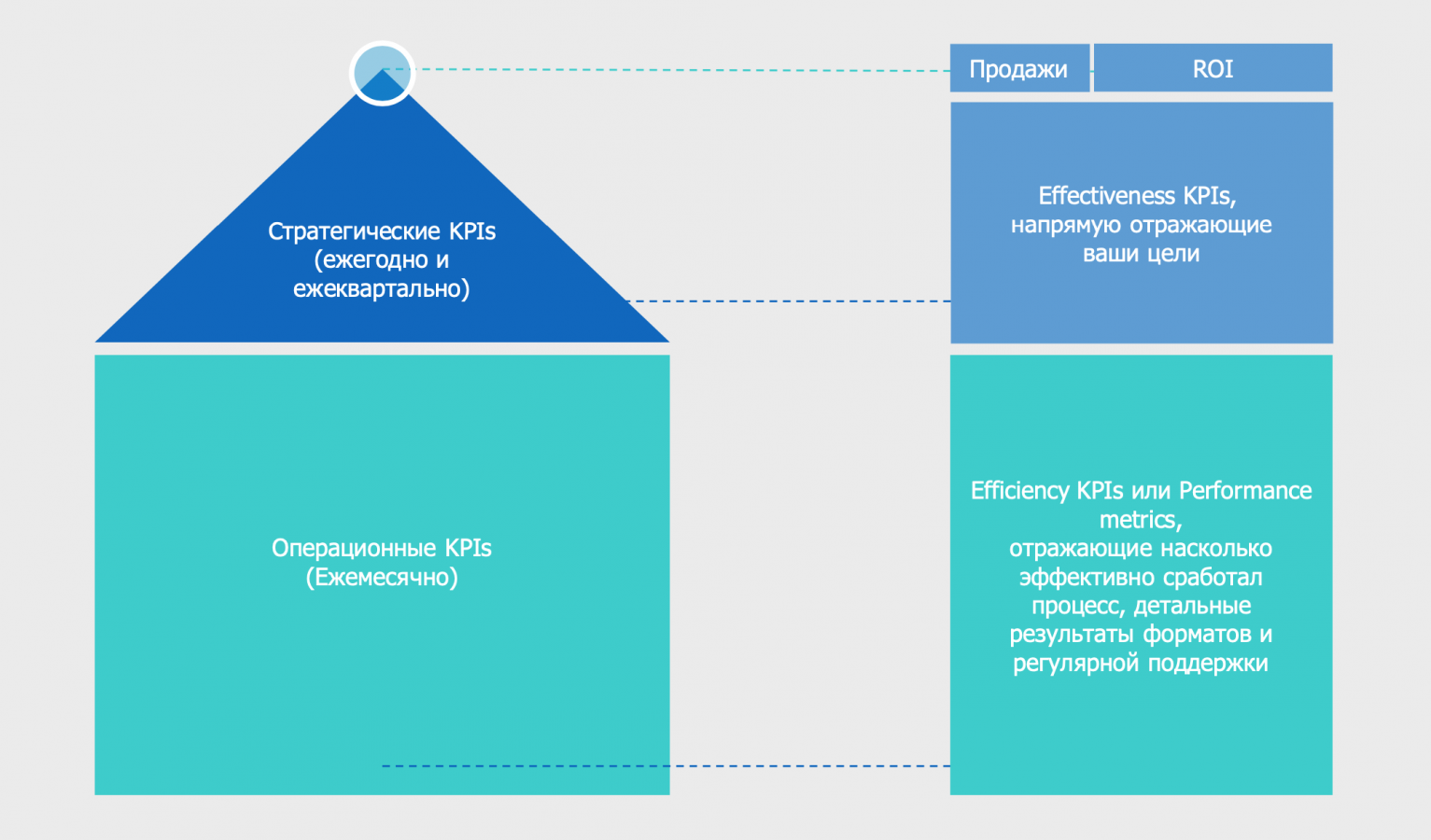 Говоря об эффективности и эффективных KPI, важно провести параллель между двумя, на первый взгляд, близкими понятиями — effectiveness и efficiency. Первое описывает, насколько успешно вы достигли цели. Какое количество продаж получилось, сколько людей пришло. Второе — насколько качественно вы всем управляли. Какая была цена за каждый лид, насколько эффективно спланировали медиамикс.