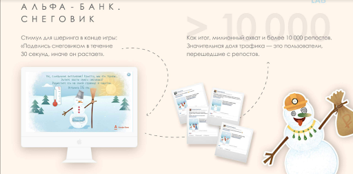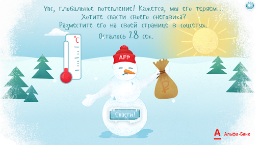 Для клиентов банка креаторы придумали неординарное поздравление с Новым годом, при этом максимизируя вирусный эффект от обычной рассылки. Игра проходила под звуки падающих снежинок. Разработчики игры предложили пользователю скатать из трех шаров своего собственного «кастомного» снеговика.