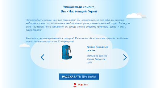 Новогодняя игрушка была не единственной разработкой для «Альфа-банка». Креаторы подарили клиентам гендерную открытку — поздравление мужчин с 23 февраля.
