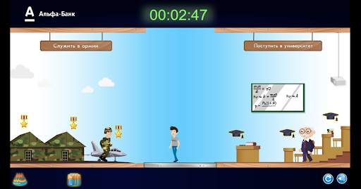 Разработчики решили пройти с мужчиной весь его жизненный путь с пеленок. На каждом этаже перед мужчиной вставал непростой выбор, от которого зависело всё: встреча с силами правопорядка, выбор между семьей и карьерой, строительство дома, путешествия и, наконец, заслуженный отдых.