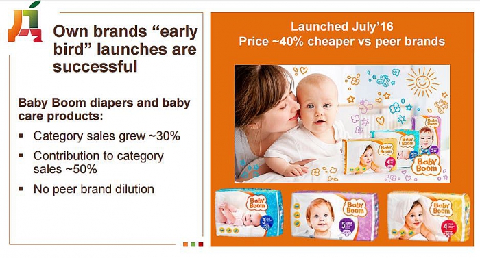 Кроме того, компания начала расширять линейку собственных торговых марок (СТМ). В третьем квартале был запущен бренд Baby Boom (подгузники и средства для ухода за детьми) и мороженое Vivante. Данные линейки товаров производятся в России. В планах компании — улучшение коммуникации через существующие каналы, повышение эффективности в сфере организации продаж, логистики и в работе главного офиса.