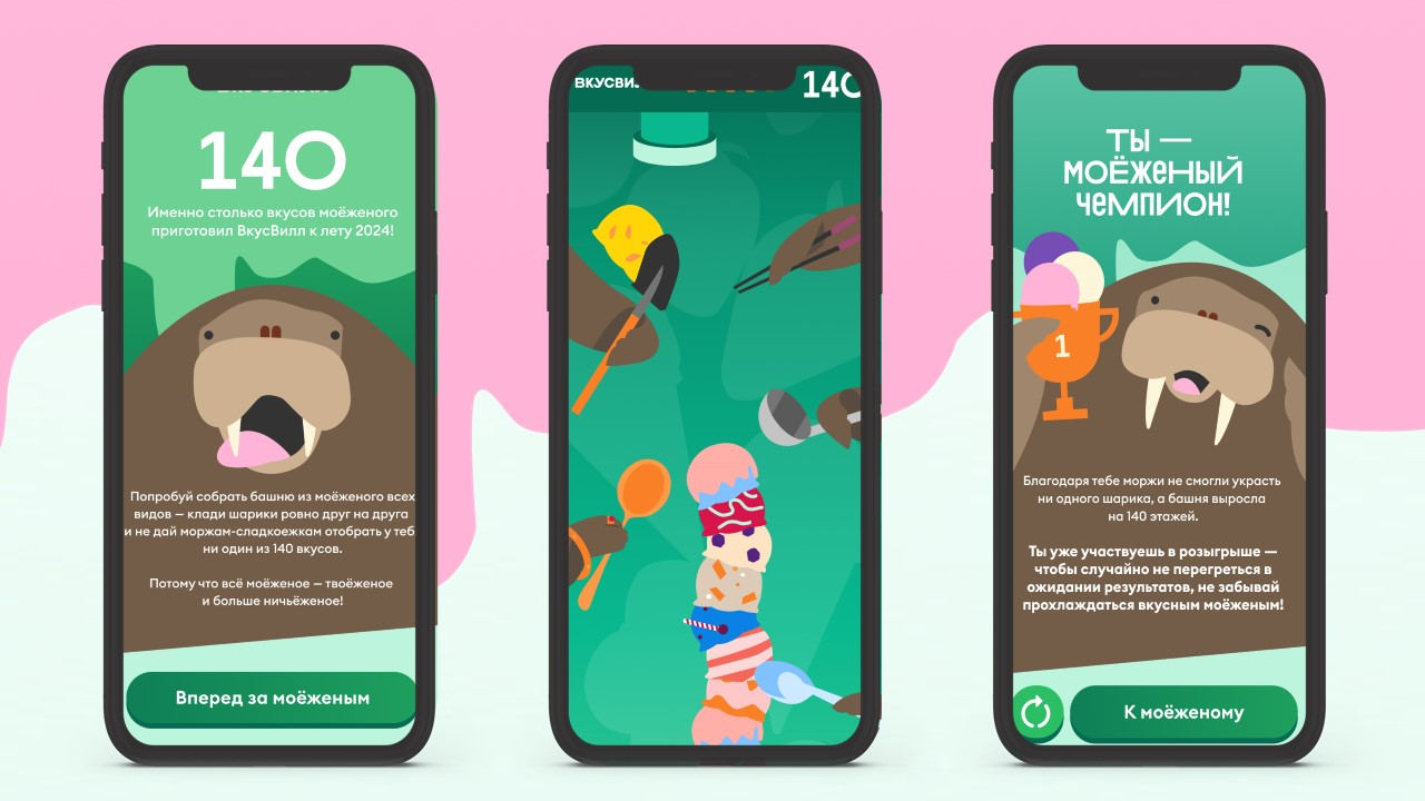 Мечты о небоскребе из любимого десерта заслуживают отдельной иллюстрации. «ВкусВилл» воплотил эту идею в цифровом формате, запустив «Моёжебот». Она основана на классическом таймкиллере 2000-х Tower Bloxx, где вместо этажей нужно ставить шарики мороженого друг на друга. Подробнее на Sostav.
