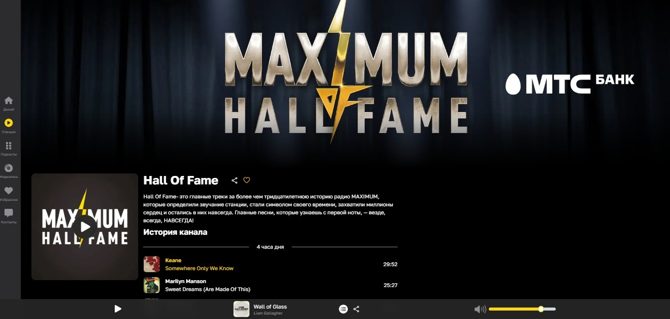 Проект «Зал славы» MAXIMUM, «Русская Медиагруппа» реализует совместно с «МТС Банком». Будучи технологичной платформой, холдинг выбрал наиболее технологичного партнера, который поддержал проект. «МТС Банк» является единственным рекламодателем, который в течение трех месяцев будет представлен на всех цифровых платформах радио MAXIMUM. В свою очередь, банк также подготовил креативы в формате радиостанции.