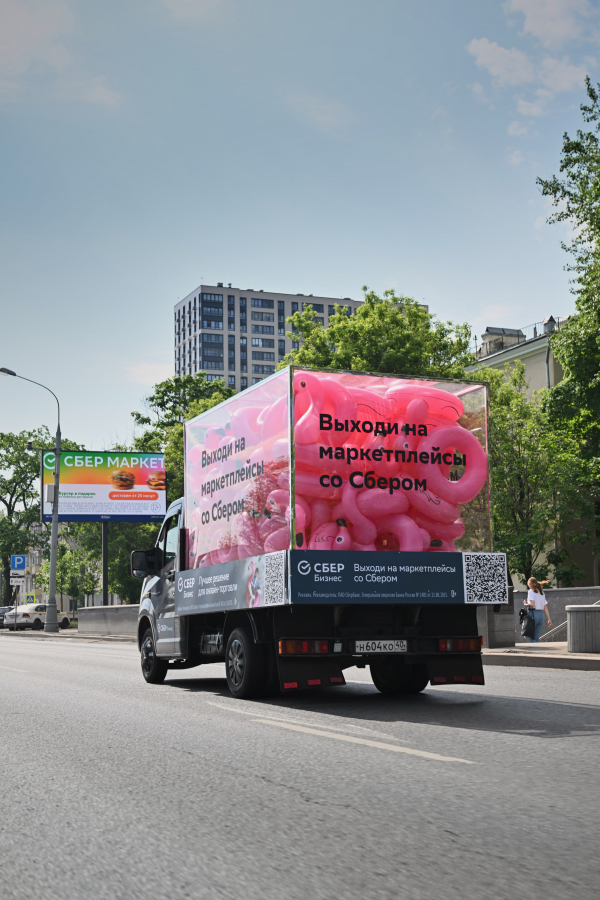 «Сбер» необычным способом поддержал свой e-commerce проект: они запустили по Москве прозрачный грузовик, наполненный надувными розовыми фламинго. Машина останавливалась возле крупных торговых центров, а на ней было написано: «Выходи на маркетплейсы со "Сбером"». Подробнее на Sostav.