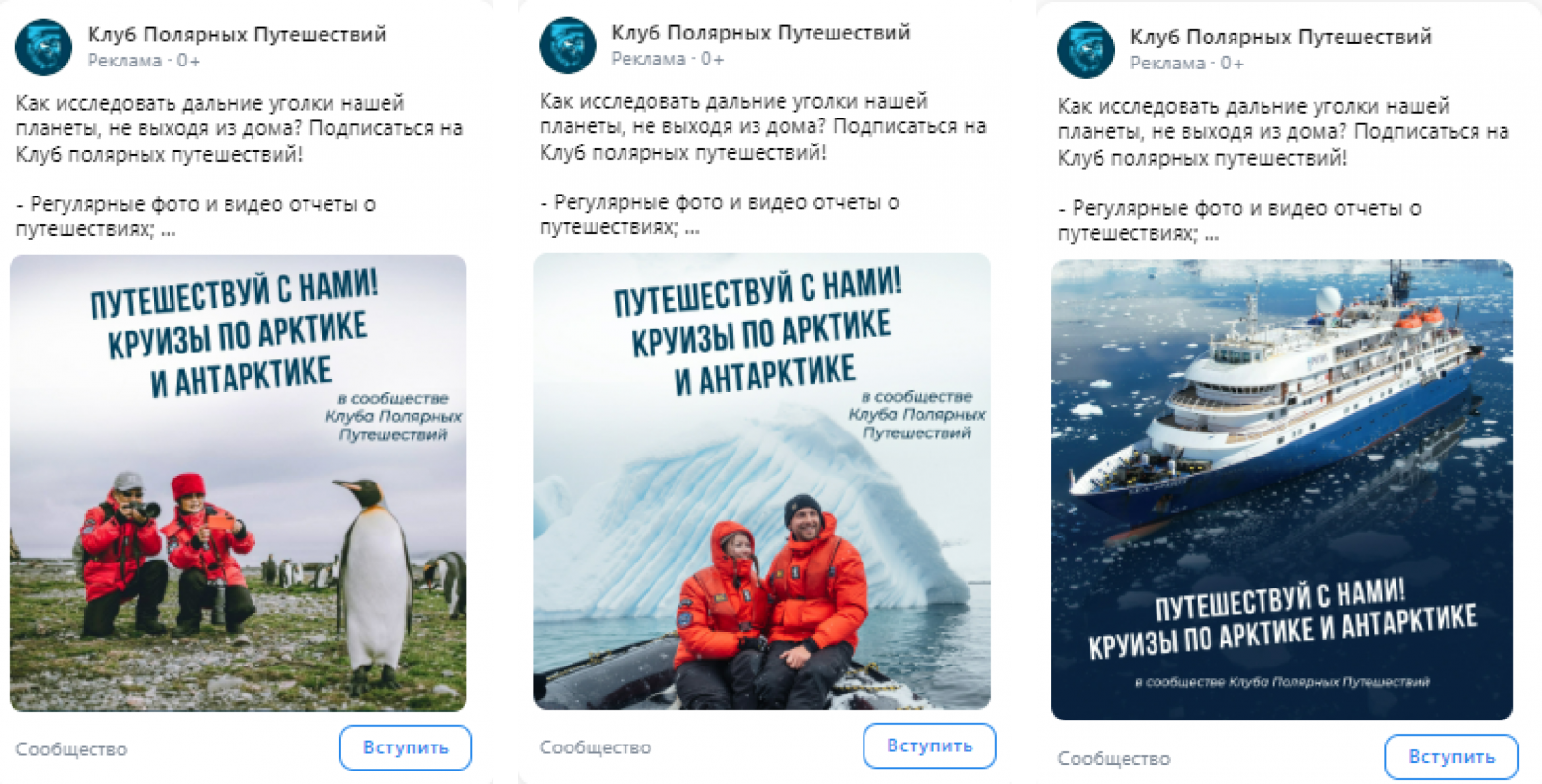 MediaNation успешно запустило продвижение сообщества «Клуба полярных путешествий» в социальной сети «ВКонтакте». Созданные креативы целились в разные категории пользователей: