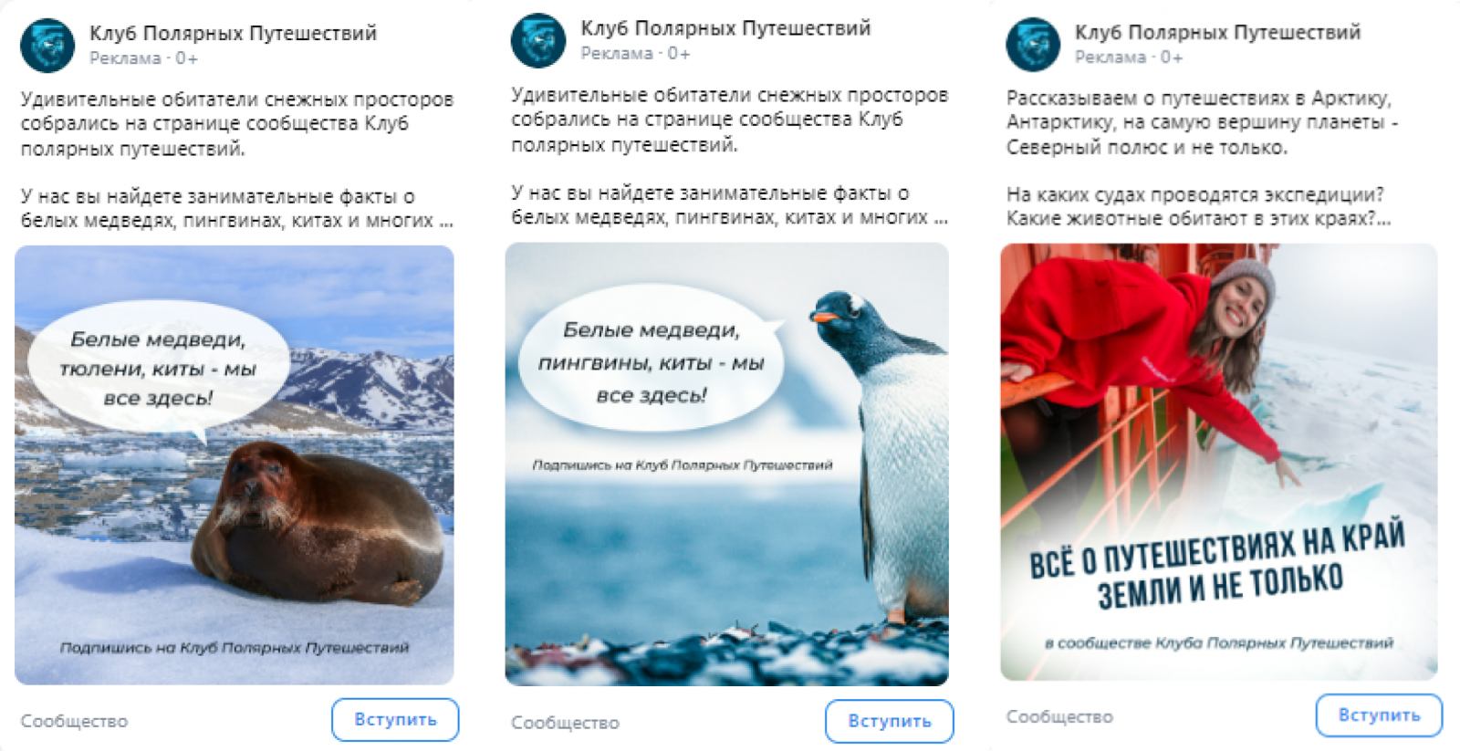 3. Любители животных: «Белые медведи, пингвины, киты — всё здесь! Подпишись во ВКонтакте на Клуб Полярных Путешествий».
