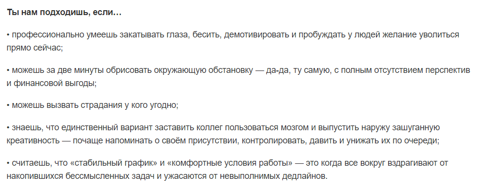 Если вы хотите опубликовать своё предложение по работе (каким токсичным оно бы ни было), пишите на vacancy@sostav.ru