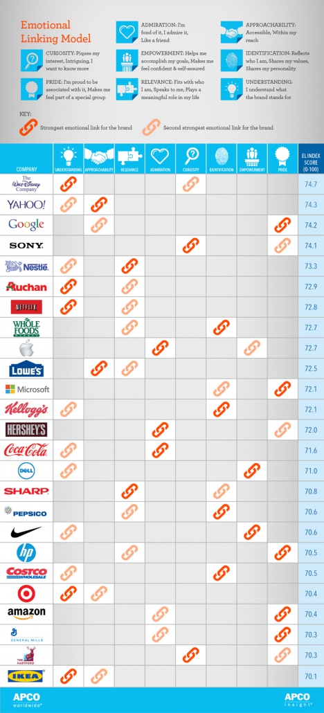 Основой для оценки компаний стали 8 выделенных APCO Worldwide эмоций, которые люди испытывают по отношению к различным компаниям, в том числе понимание, доступность, уместность, восхищение, любопытство, отождествление, доверие и гордость.