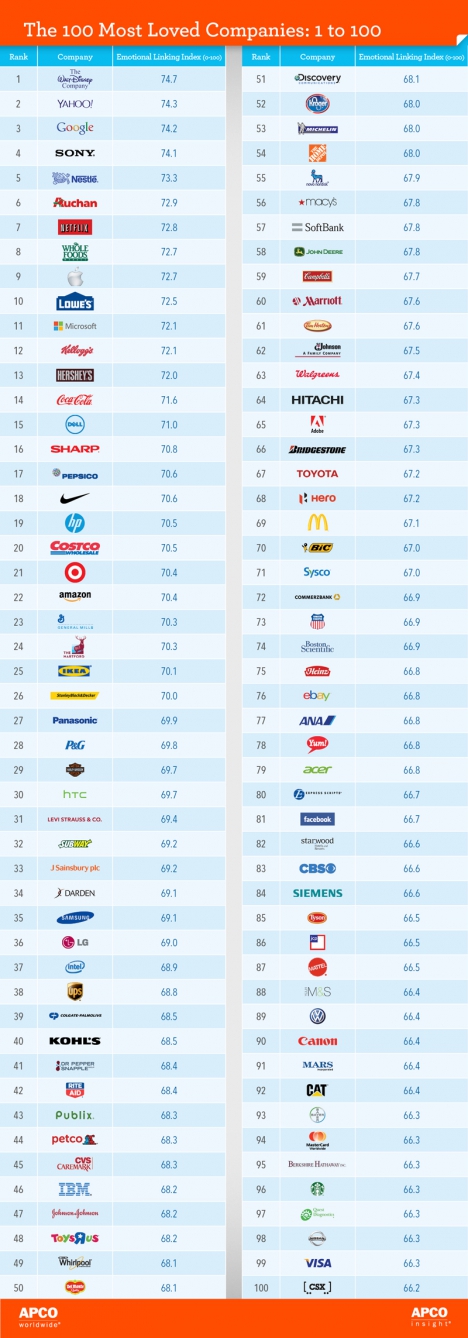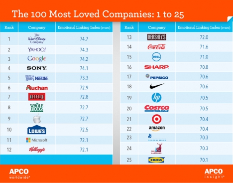 Cамыми любимыми брендами потребителей по всему миру являются Walt Disney, Yahoo!, Google, Sony и Nestlé, выяснили исследователи американской консалтинговой фирмы APCO Worldwide. В десятку также вошли Auchan, Netflix, Whole Foods, Apple и Lowe's.