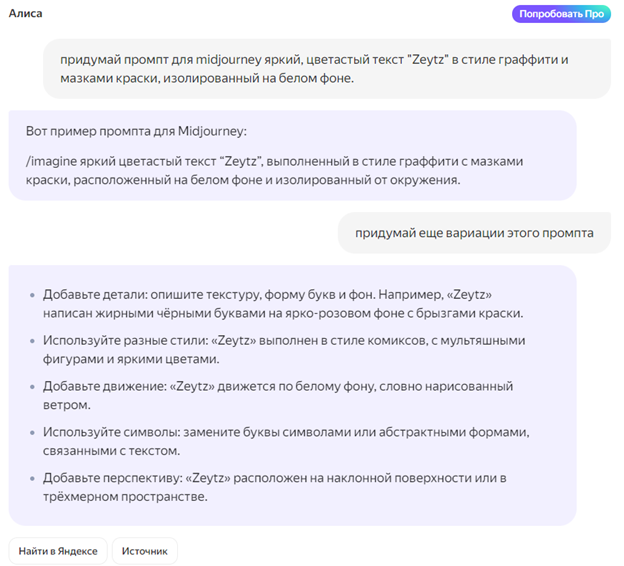 Если вам предстоит создать сложную картинку, то можно создать промт для Midjourney с помощью текстовой нейросети. Мы чаще используем Yandex GPT, с русским языком она работает лучше. Хотя с релизом ChatGPT 4, постепенно переходим на неё. Нейросеть может выдать множество вариантов и каждый из них можно предложить для Midjourney.