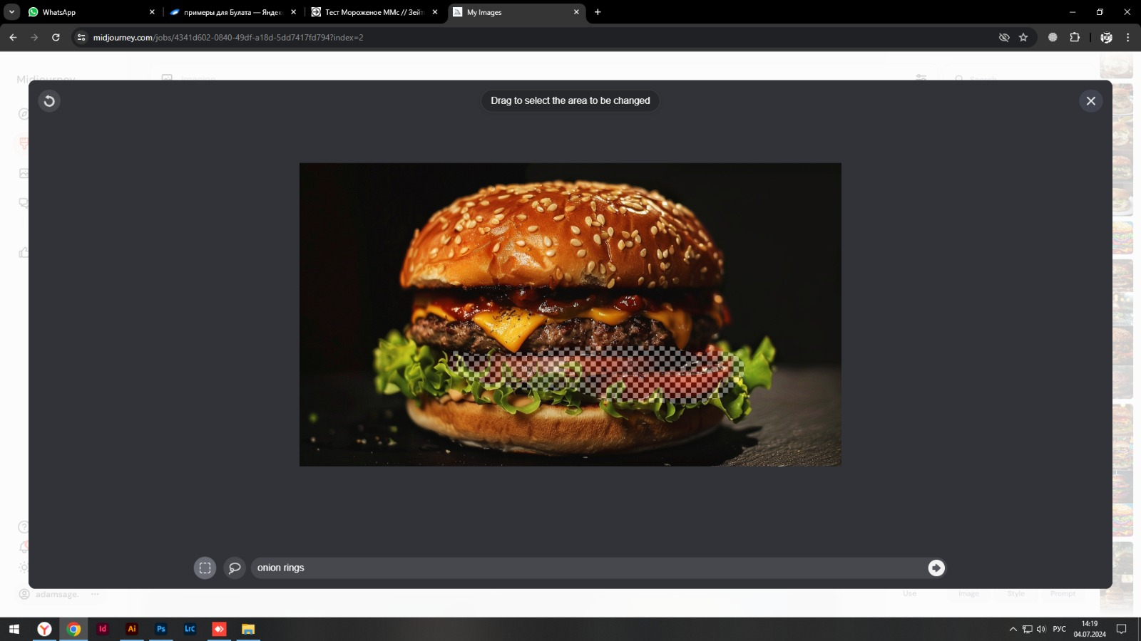 Казалось бы, можно дать полностью задание отрисовать бургер и поместить его на картинку, но пока нейросеть с этим не справляется. Клиенту часто бывает важно в каком порядке располагаются элементы внутри бургера, и даже если вы детализировано зададите промт, то результат будет всё равно хаотичным.
