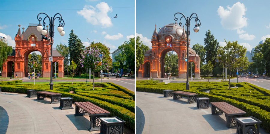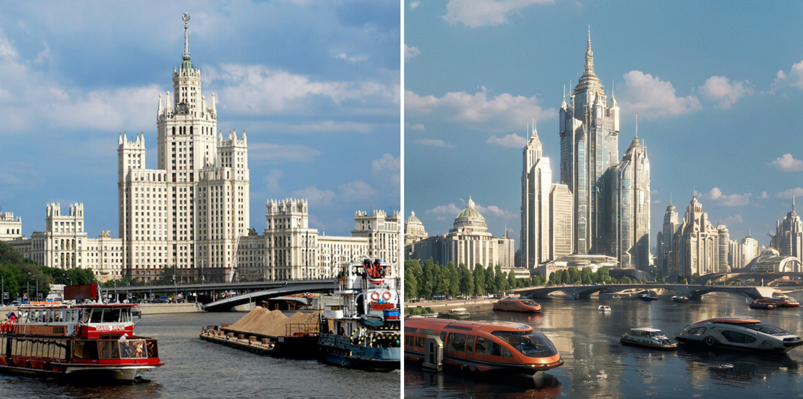 Другой пример — клиент попросил создать облик городов России в далёком будущем. Если бы над концептом и прорисовкой работал отдельный человек, работы было бы на неделю, а с нейросетью Stable Diffusion можно получить результат за пару минут.