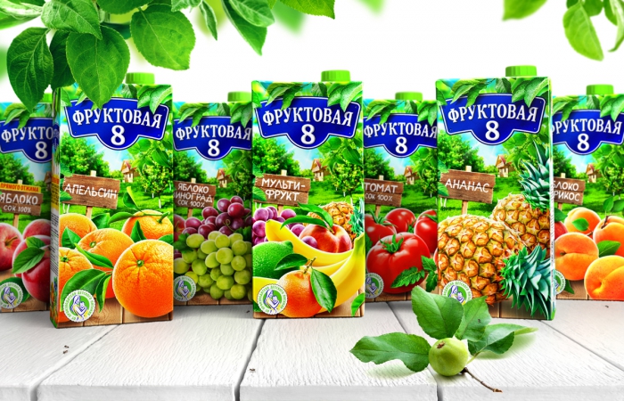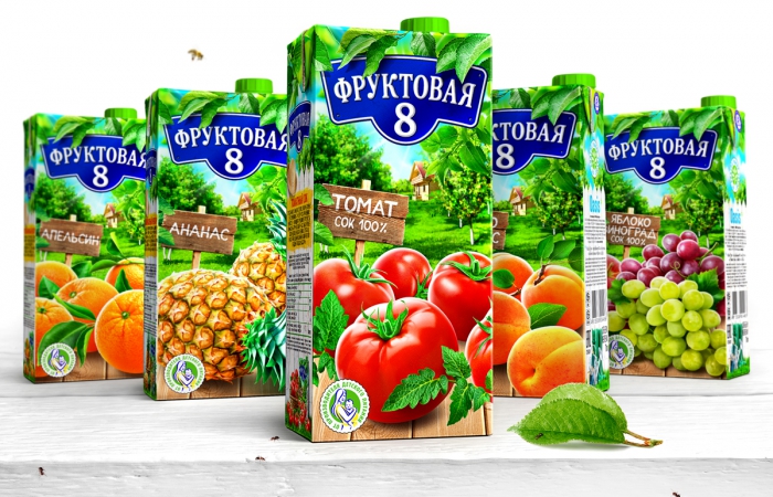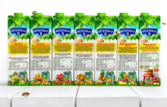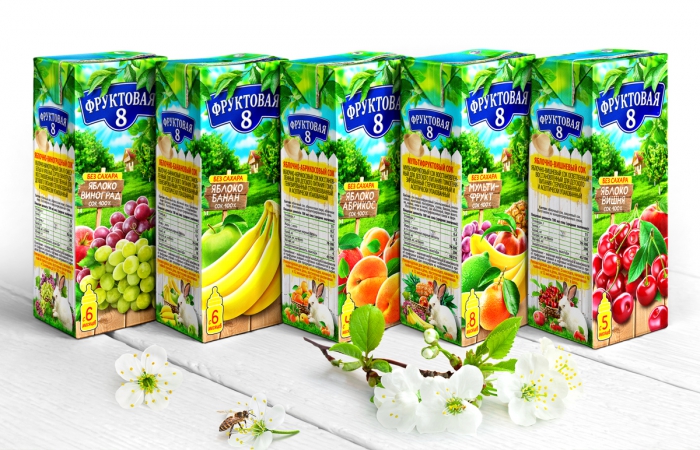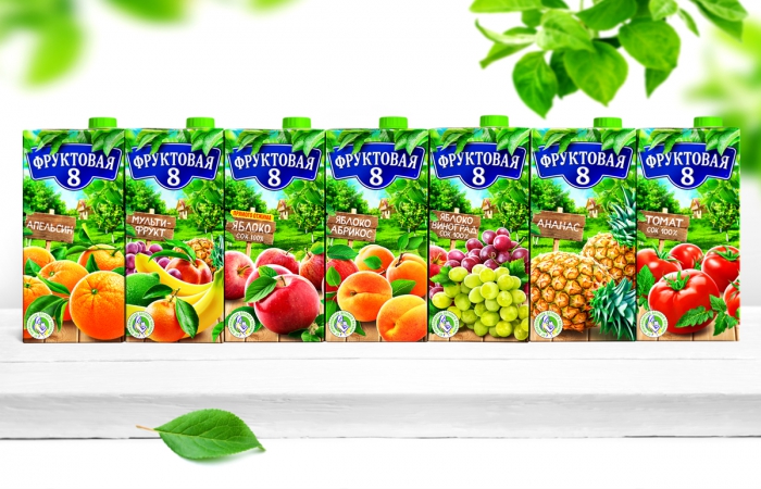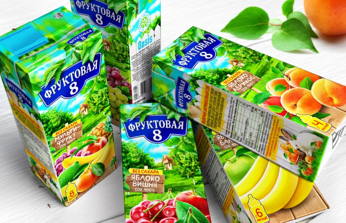 Дизайнеры белорусской студии Акима Мельника подготовили и представили новый дизайн упаковок бренда соков и нектаров «Фруктовая 8» (принадлежит белорусской компании ООО «Оазис Груп»). В студии провели работу над стилеобразующим дизайном двух базовых и двенадцати рядовых упаковок в серии бренда «Фруктовая 8».