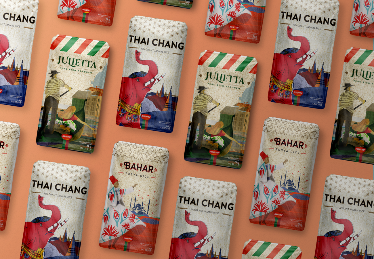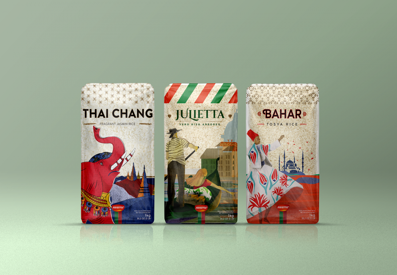 Яркий пример такого подхода — серия упаковок риса для португальского сельскохозяйственной и производственной компании Novarroz. Выразительный стиль иллюстраций и обыгрывание национального колорита создают узнаваемые и уникальные образы. Сам продукт изящно включен в иллюстрацию, является фоном. Каждый из пакетов имеет свою концепцию, при этом все вместе они имеют общий графический и концептуальный знаменатель, одинаковую сетку и принципы построения макета, что позволяет сохранять как их узнаваемость на полке, так и каждого SKU.