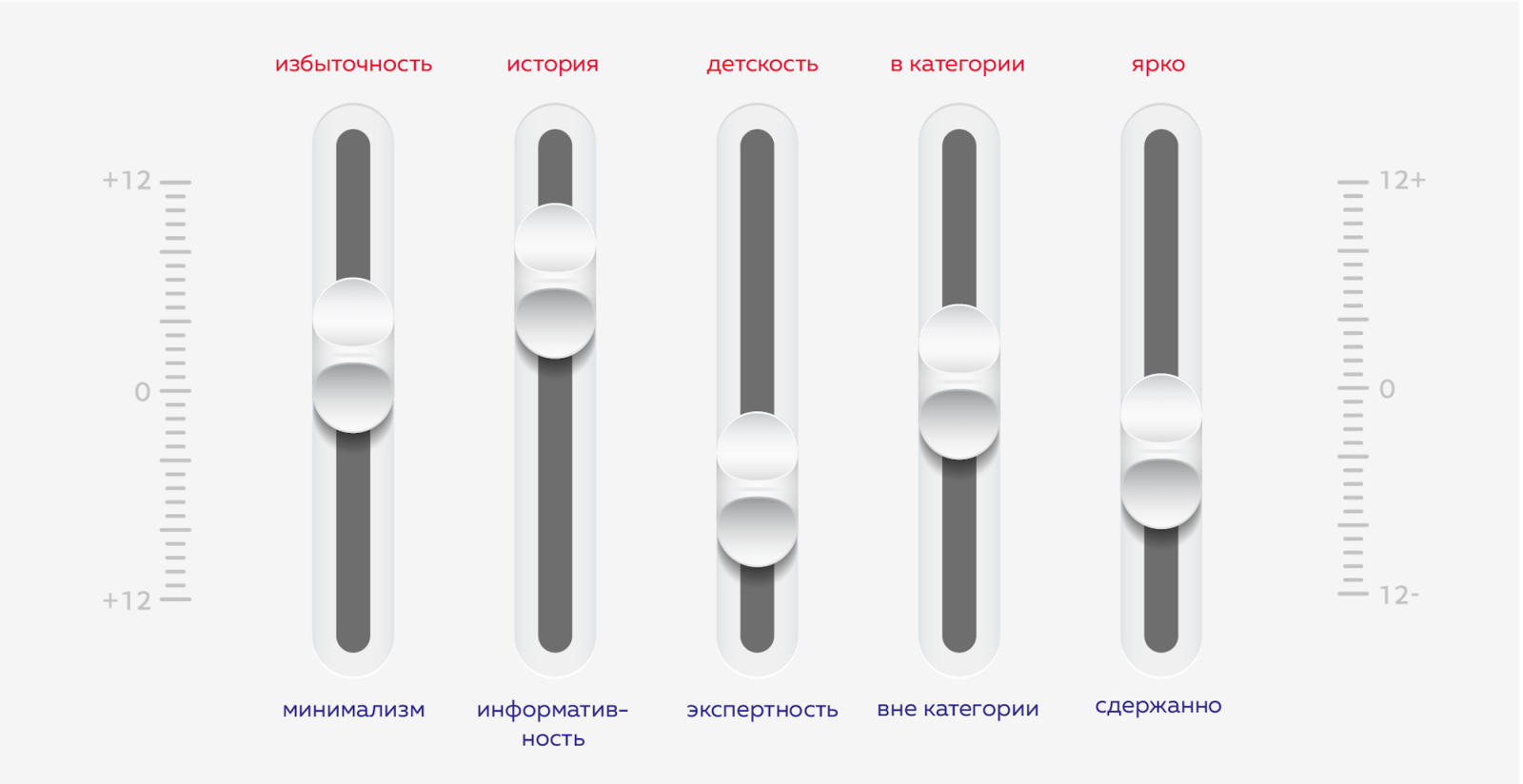 В качестве итога данного обзора можно привести вот такую условную «ди-джейскую» шкалу, которая демонстрирует богатый набор вариантов и инструментов по созданию уникальной упаковки. Как определить в данном конкретном случае, куда двигаться: быть информативным, или рассказать увлекательную историю? Категорийным, или разорвать шаблон? Коммуникация должна быть избыточной, или минималистичной? Как подобрать и выстроить верный тон именно для вашей аудитории?