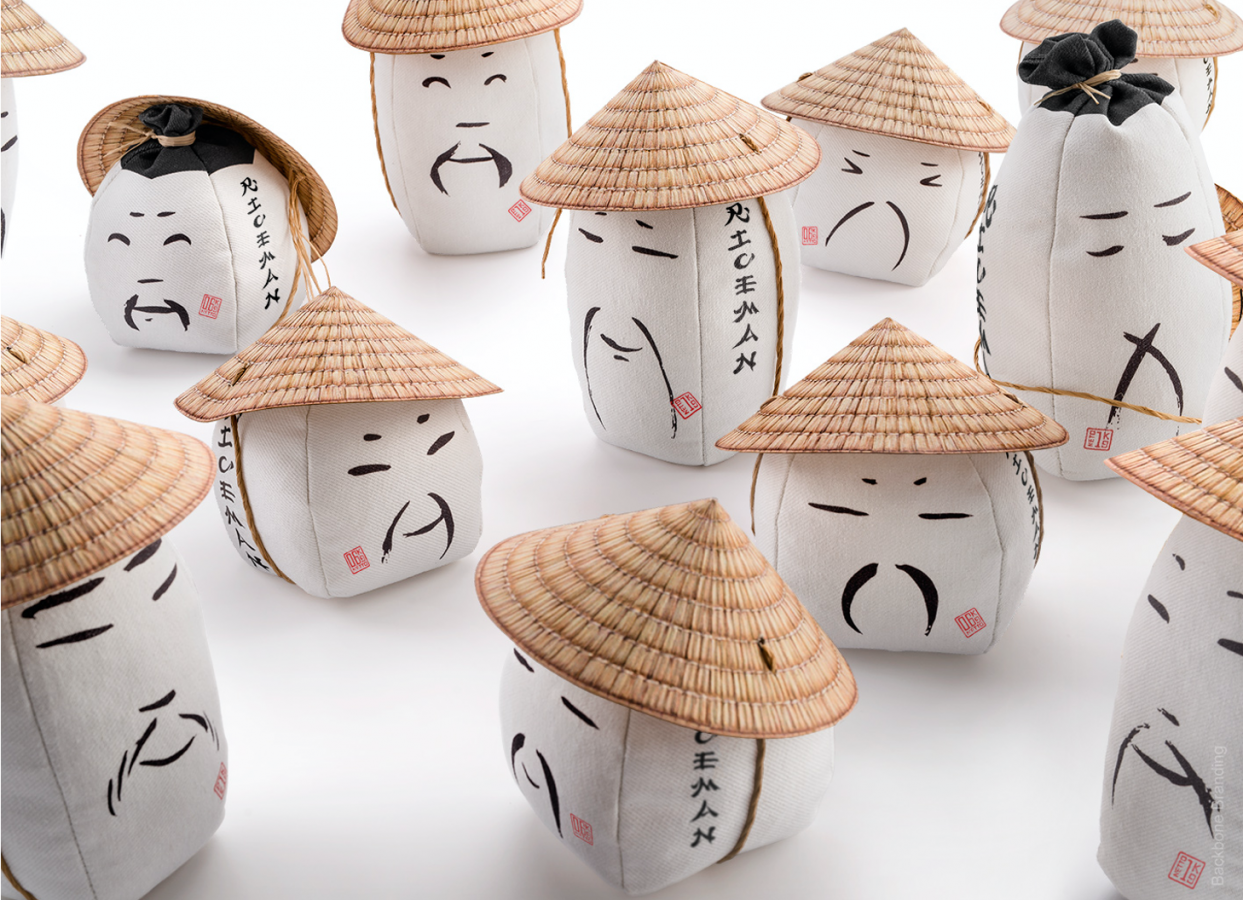 Функционально продумана каждая деталь: форма мешка указывает на тип риса, выбор материала отражает экологичность продукта, а картонные крышки в форме традиционной конической шляпы можно использовать как мерные чаши. Каждая деталь продумана, а общее решение вовлекает покупателя в своеобразную игру нестандартным решением и тактильными ощущениями натуральных материалов.