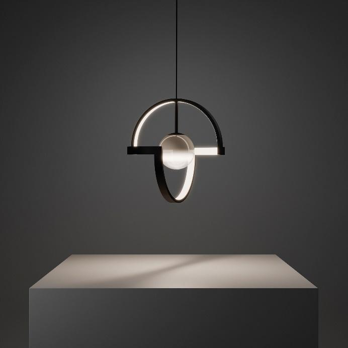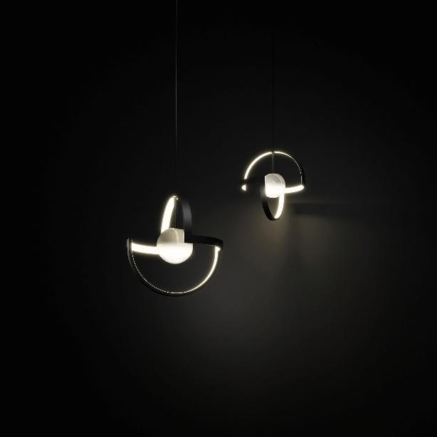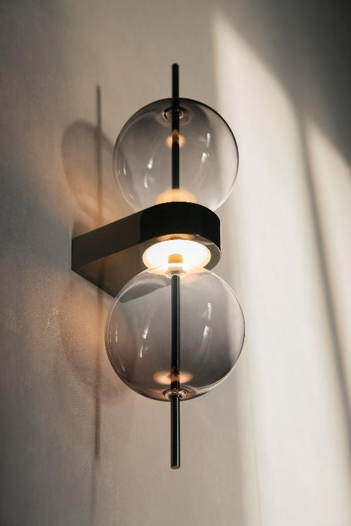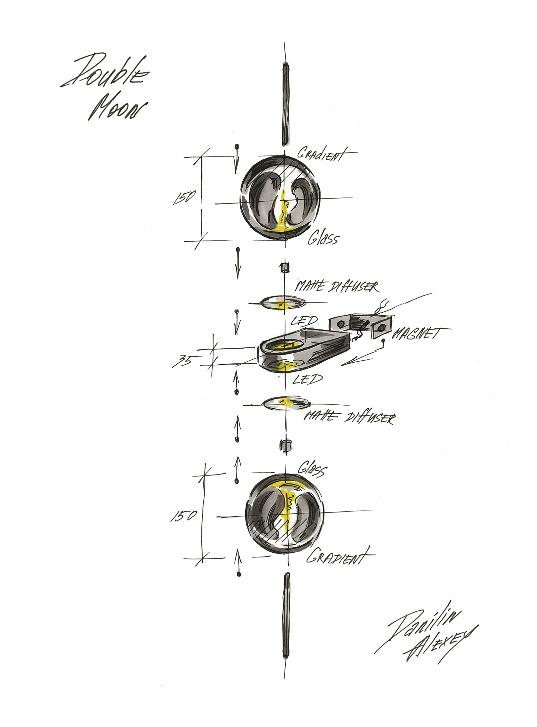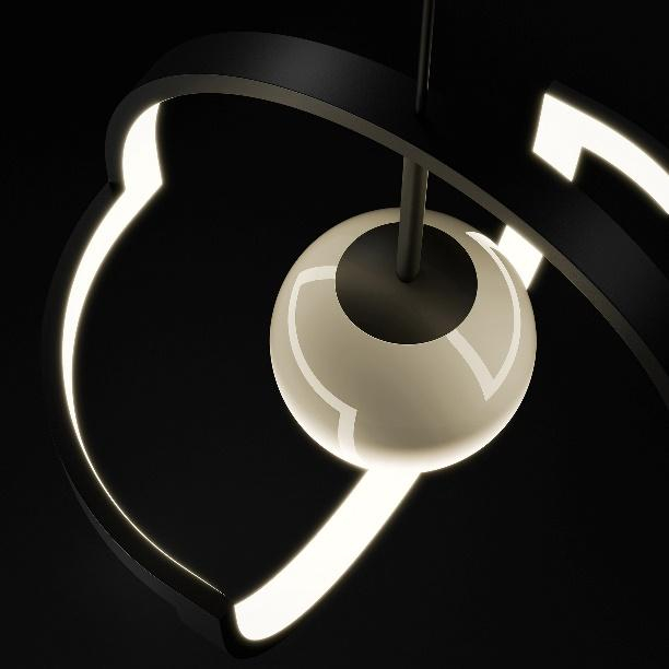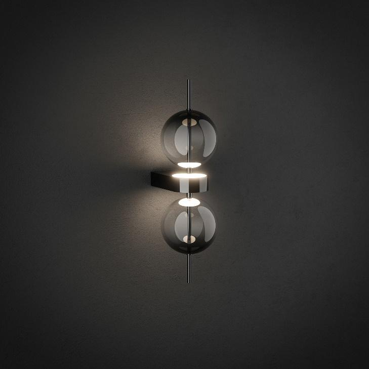 Источники света в светильнике спрятаны в основании с обеих сторон матовыми рассеивателями для создания мягкого освещения. Стеклянные шары выкрашены зеркальным градиентом, который отражает свет и создает блики. Все крепления скрыты с помощью магнитных креплений, чтобы дизайн светильника обладал визуальной чистотой.