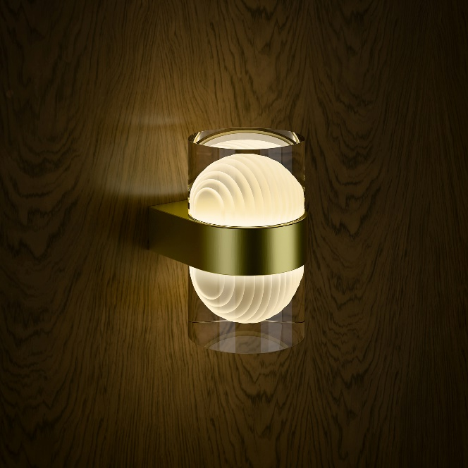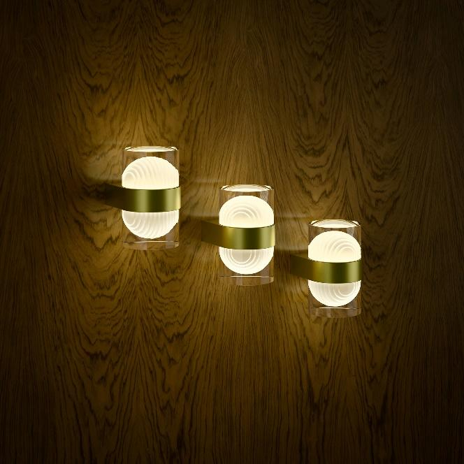 Вторая идея — трансформация, происходящая благодаря стеклянным элементам, которые можно вращать и менять, тем самым изменяя орнамент. Светильники можно устанавливать на стене как вертикально, так и горизонтально.