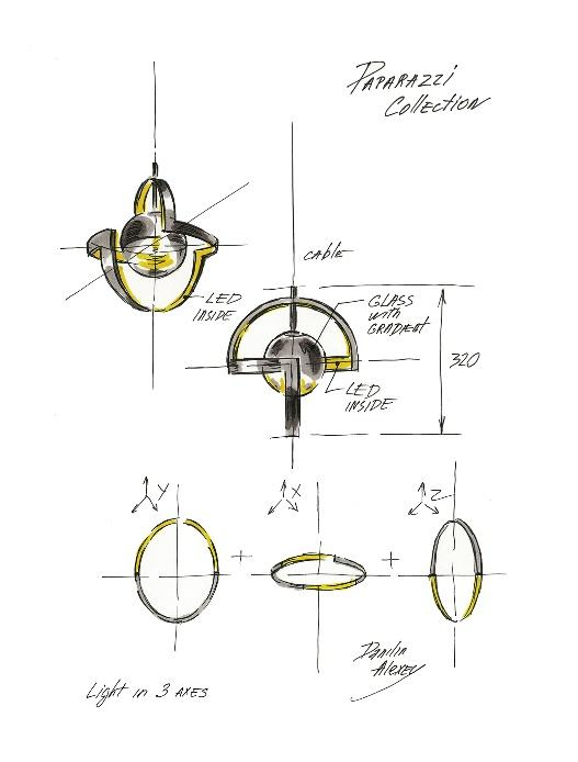 В центре коллекции Paparazzi декоративный стеклянный элемент, который благодаря конструкции из нескольких дуг освещается в трех плоскостях. Источники света закрыты матовыми рассеивателями для создания мягкого освещения, можно менять высоту светильников при установке. Стеклянная сфера окрашена белым градиентом, чтобы скрыть крепления стекла.