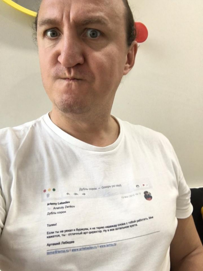 Артемий Лебедев пригласил дизайнера Анатолия Зенкова вернуться на работу в студию. Он написал ему письмо с предложением снова работать вместе. После этого Зенков распечатал письмо от Лебедева на футболке. Об этом Лебедев рассказал в своем блоге.