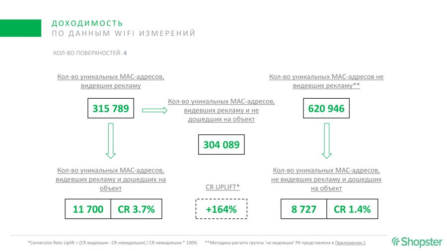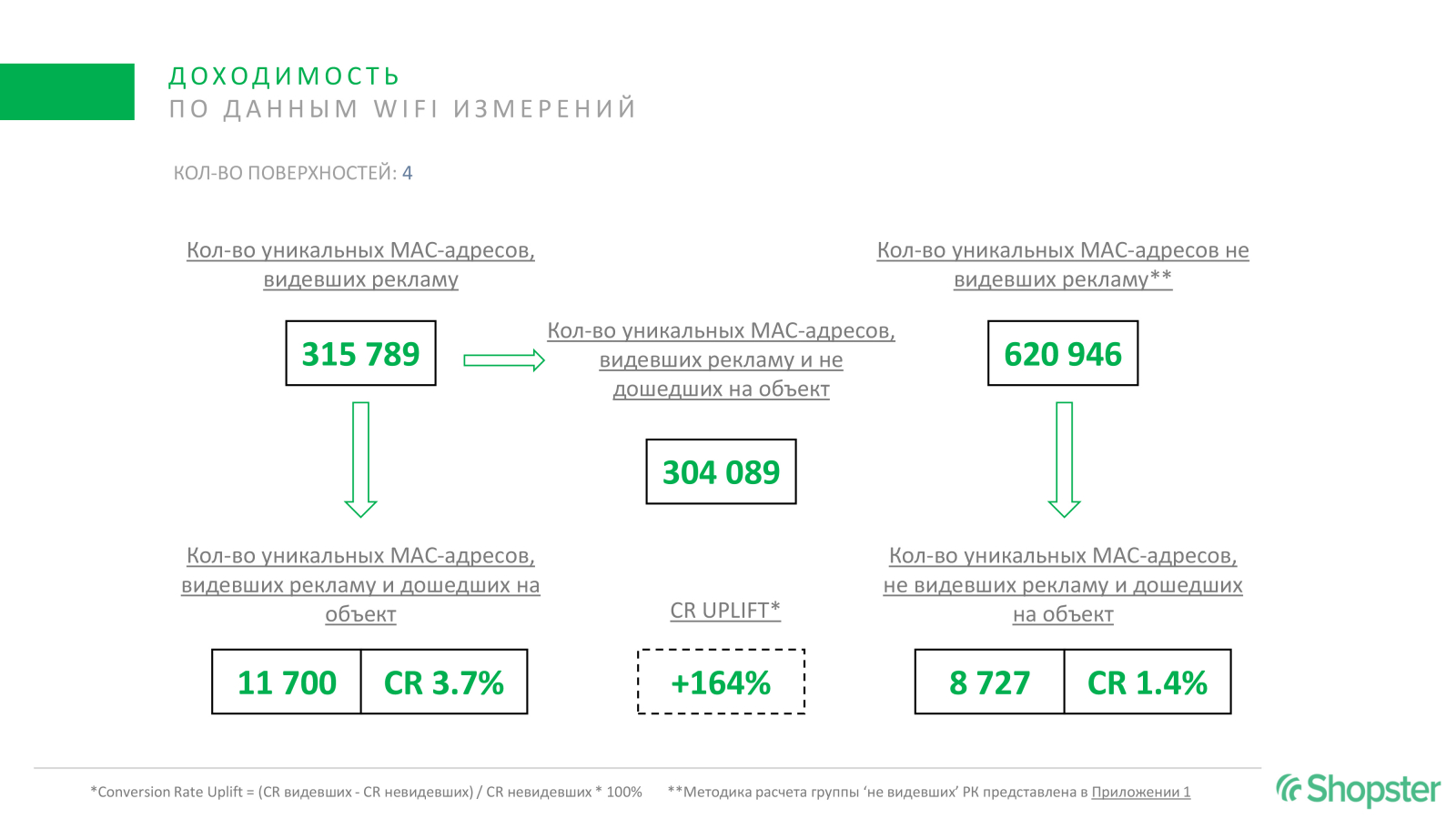 Wi-Fi устройства на DOOH-конструкциях позволяют отслеживать MAC-адреса тех, кто находится в зоне видимости рекламной поверхности, и выделять сегменты аудитории, которые видели и не видели рекламное сообщение бренда. Wi-Fi ловушки в торговом центре собирают MAC-адреса посетителей «Радуга парк». Сопоставление Wi-Fi данных с конструкций и из ТРЦ позволяют рассчитать конверсию в посещение среди двух групп посетителей (среди тех, кто видел, и тех, кто не видел рекламу торгового центра). Это показывает влияние наружной рекламы на посещаемость торгового центра.