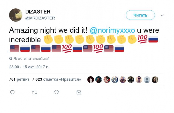 Dizaster тоже оставил впечатления от состязания на своей странице в соцсети: «Потрясающий вечер, мы сделали это! Oxxxymiron, ты великолепен!». Dizaster отметил, что этот вечер и подготовка к нему была очень интересным процессом и примером того, как должны проходить рэп-баттлы.