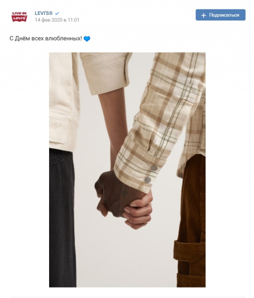 Российские подписчики H&M и Levi’s в социальных сетях раскритиковали изображения с лейсбийской и межрасовой парами. Публикация фото была приурочена ко Дню святого Валентина, который празднуется 14 февраля.