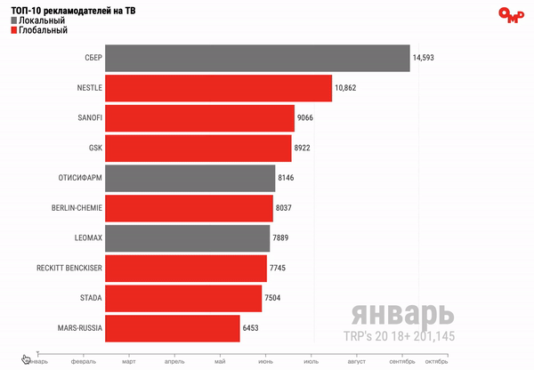 По данным Mediascope, на которые ссылается спикер, в октябре по физическим объёмам рекламы на ТВ лидирует Сбер. Второе место занял Home Shopping Russia, третье — «Вкусно — и точка», четвёртое Leomax, пятое — Ozon. Также в десятку вошли «Тандер» (бренды «Магнит», «Магнит у дома» «Магнит Косметик» и другие), «Тинькофф», ВТБ, «Маркет ТВ», «Совкомбанк».