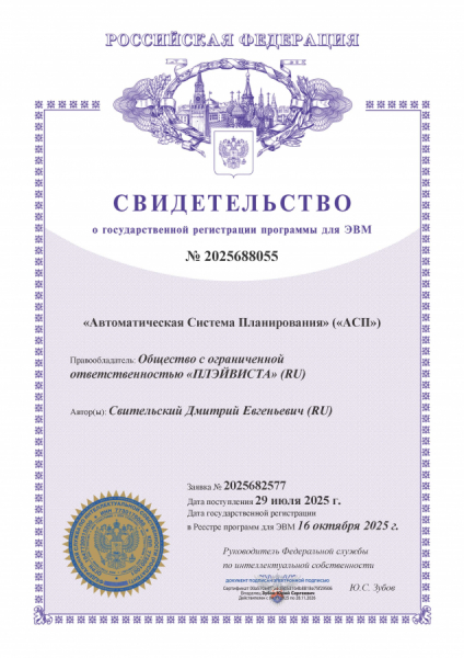 Собственный программный комплекс АСП (Автоматическая Система Планирования) — действительно уникальный инструмент, позволяющий любому, даже начинающему, медиапланеру заменить собой баинг-группу из 3−4 опытных спецов. И нам приятно осознавать, что в этом году наше ПО получило лицензию в Роспатенте, юридическое подтверждение уникальности и актуальности продукта. А значит, команда «врачей» из PlayVista сделала верную ставку на технологичность, автоматизацию и интеллектуальный потенциал, способные быстро помогать даже супергероям.