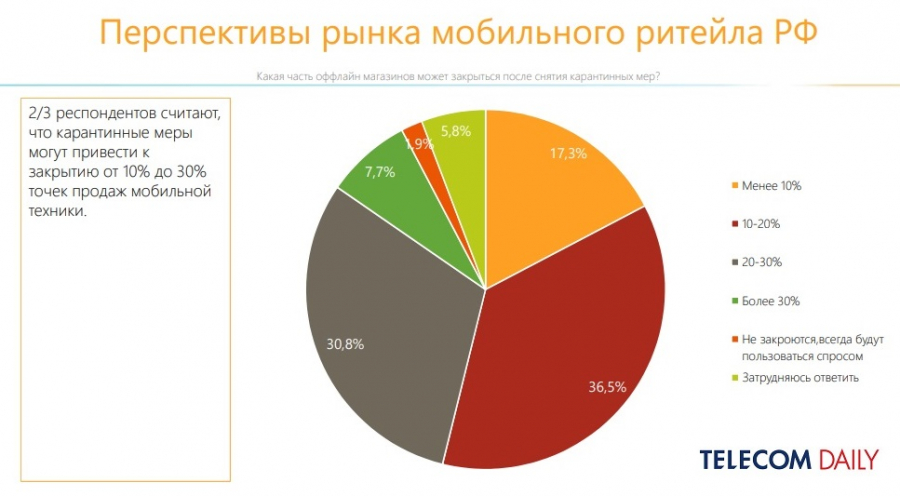 Закрытие ждет 20−30% магазинов, полагает 31% опрошенных. Уход с рынка 10−20% торговых точек предсказывают 36,5% респондентов. 8% участников опроса и вовсе считают, что более 30% магазинов прекратят работу. При этом оптимистичный прогноз дают 2% опрошенных: по их мнению, салоны связи всегда будут иметь спрос и не закроются.