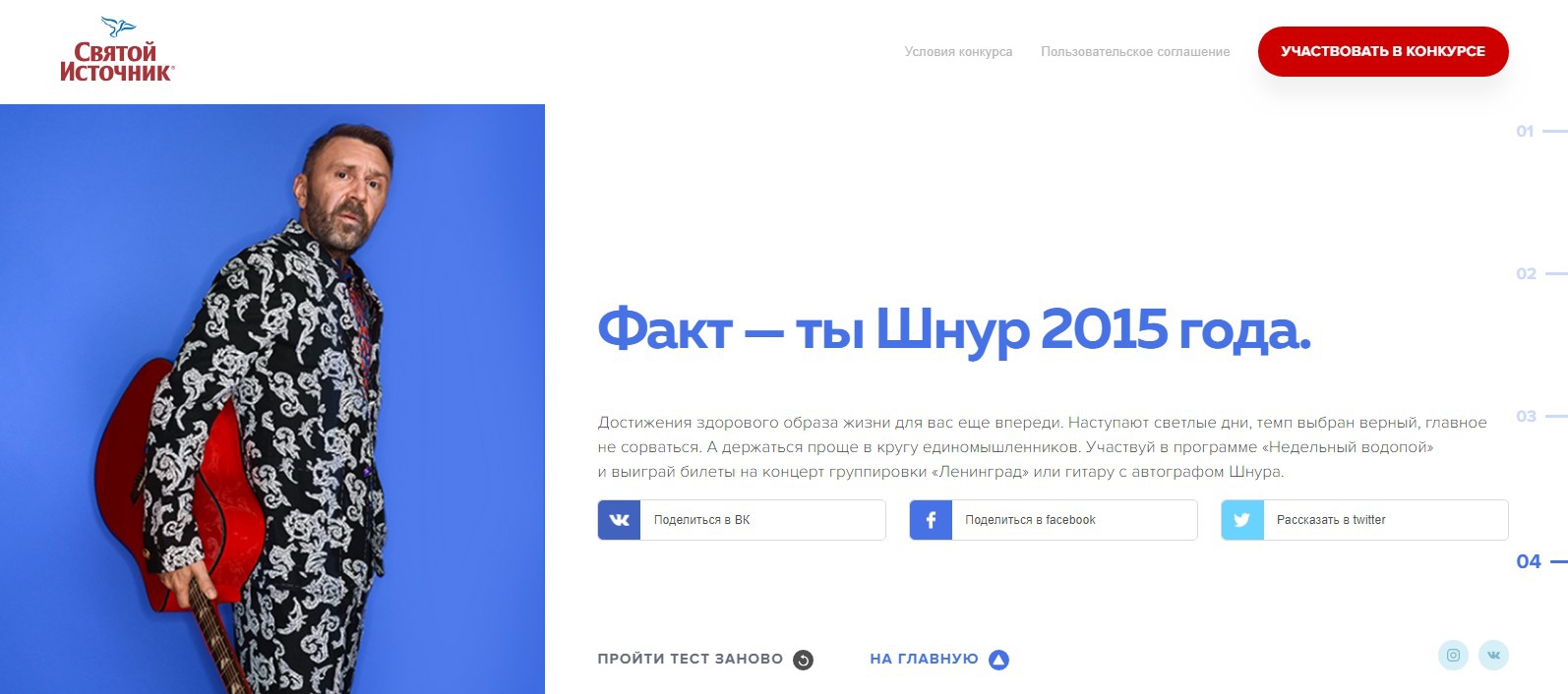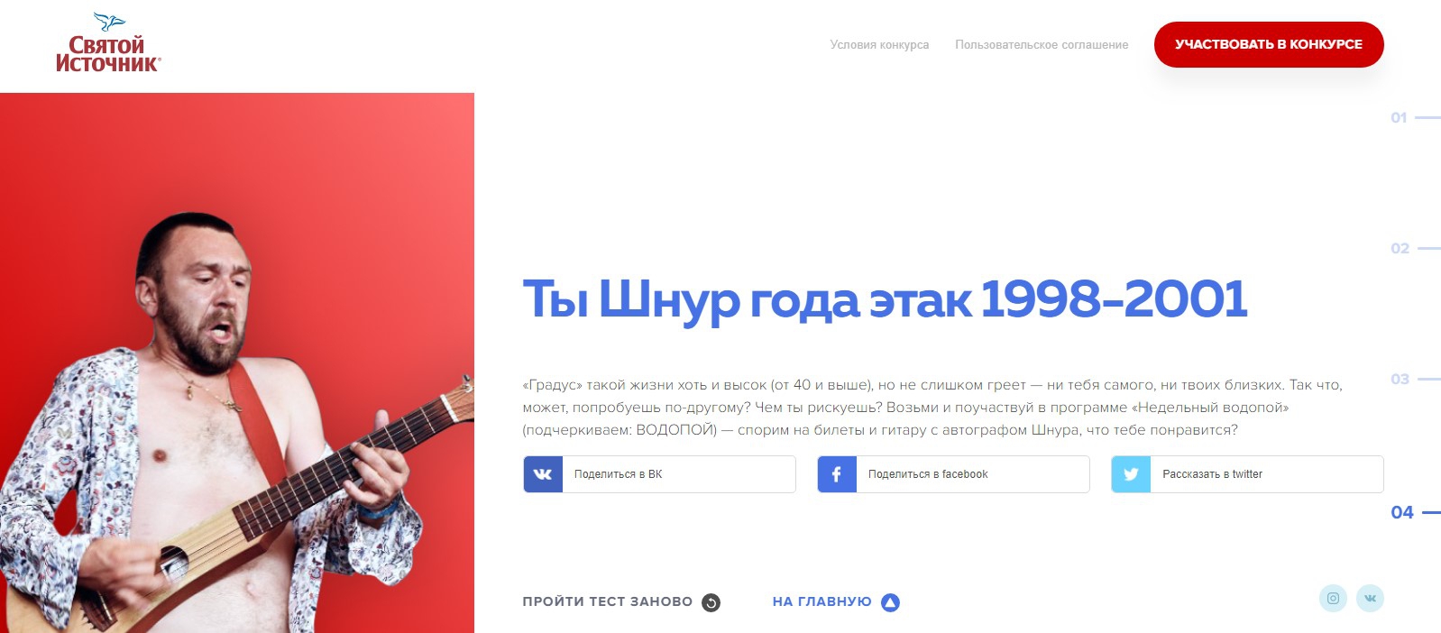 Также в рамках кампании запущен интерактивный тест «Шнурометр». Отвечая на вопросы о здоровых привычках, пользователи могут узнать, Шнуру какого года они соответствуют.