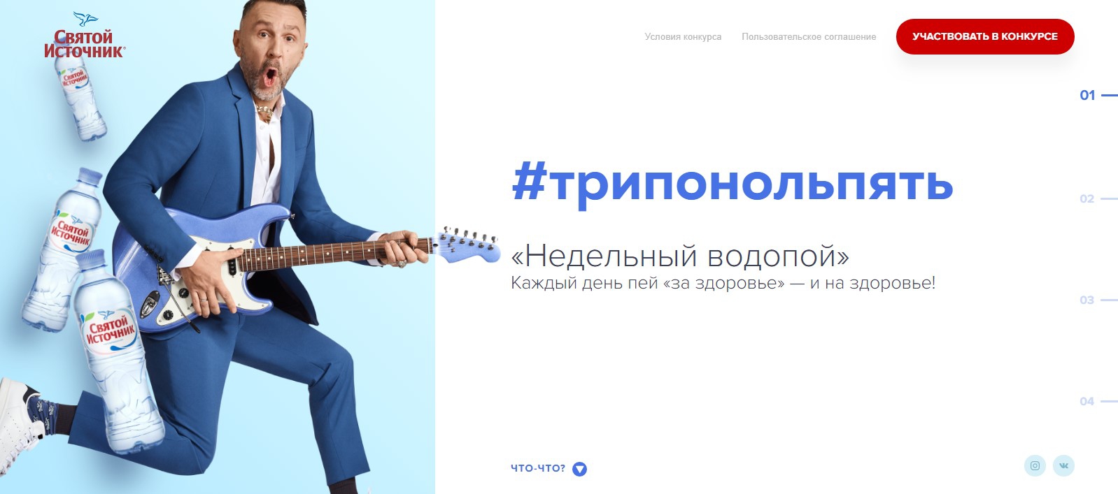 Участникам предлагается выпить 21 бутылку воды 0,5л «Святой Источник» в течение одной недели и выложить креативный фотоотчет об этом в своем профиле Instagram с хэштегами #трипонольпять и #недельныйводопой.